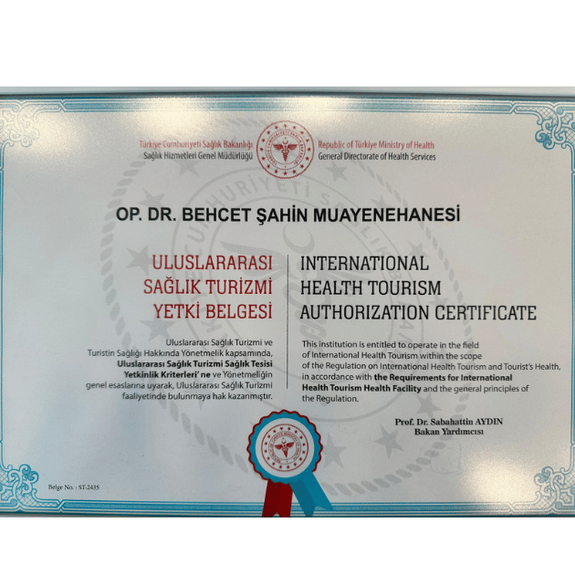 Kliniğimiz Türkiye Cumhuriyeti Sağlık Bakanlığı onaylı Uluslararası Sağlık Turizmi Yetki Belgesine sahiptir.